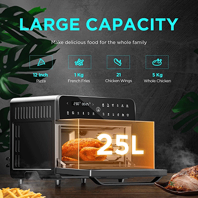 NỘI THẤT RỘNG RÃI: Dung tích lớn 25L với 4 kệ có thể nấu pizza 12 inch, 1kg khoai tây chiên, 24 cánh gà, 5kg gà nguyên con, hoàn hảo cho gia đình 4-6 người hoặc bữa tiệc nhỏ